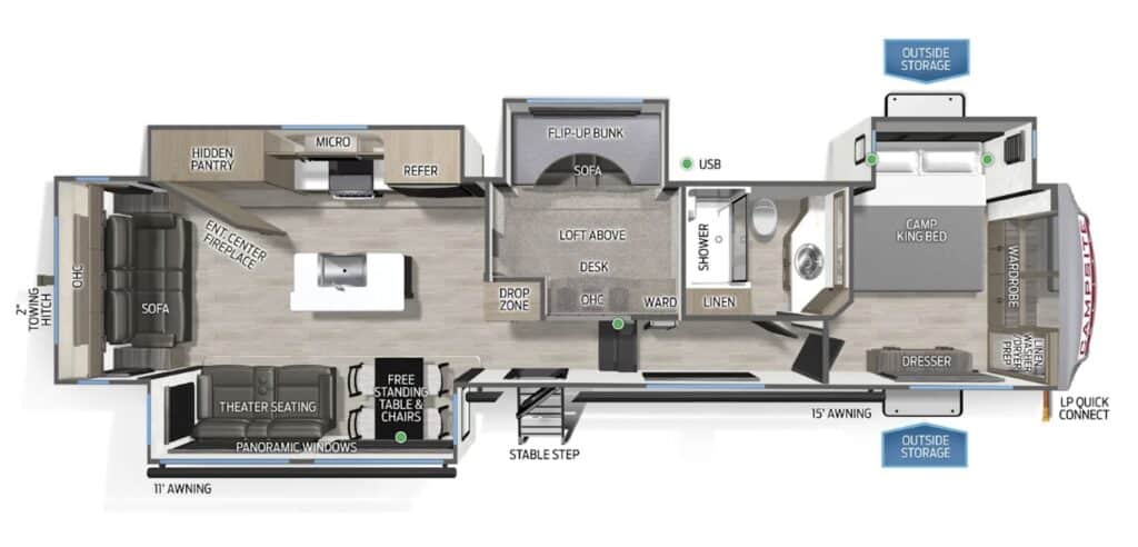 A mid-bunk 5th wheel with a loft is another excellent option for RVers seeking a 3 bedroom 5th wheel setup. This layout is also ideal for families who travel full-time and want a dedicated school space.